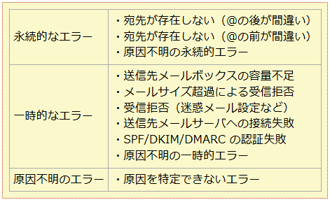 受信側のサーバやシステムから届く「バウンスメール」によって主に3つに区別しています。